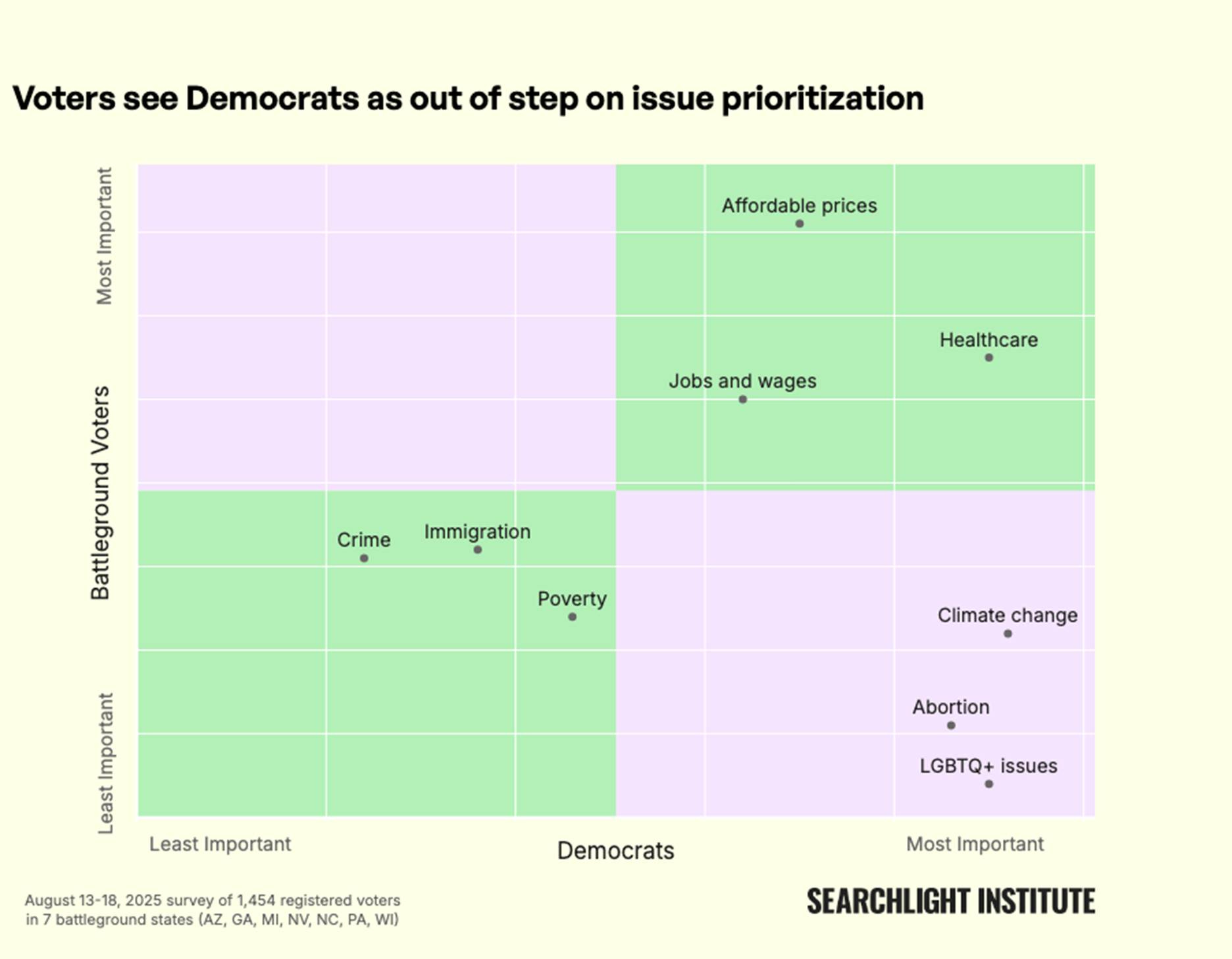 Three of the four issues voters believe are most important to Democrats—climate change, abortion, and LGBTQ+ issues—are least important to voters. If that’s the Democrats’ “vision thing,” voters aren’t buying.